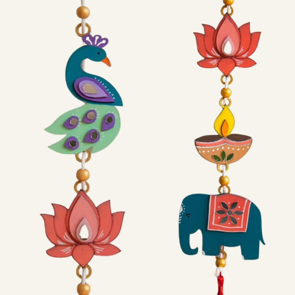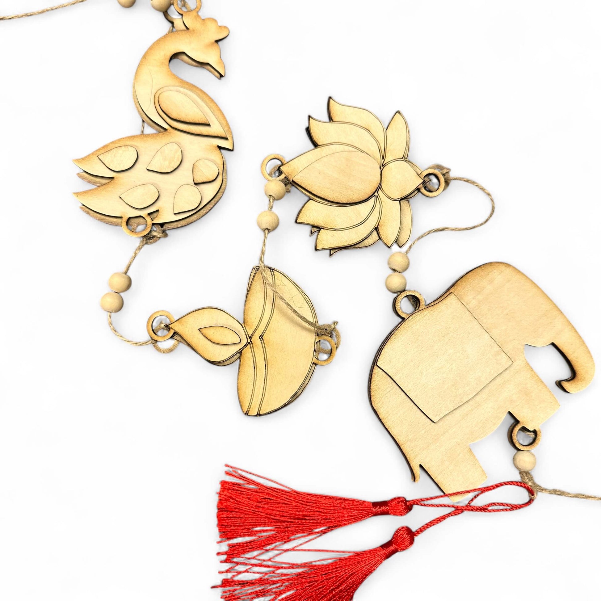 Each kit includes pre-cut wooden motifs featuring four timeless symbols (2 of each) — Peacock, Lotus, Diya, and Elephant — along with wooden beads, bright red tassels, and natural cotton rope for stringing. The layered pieces add depth and dimension, making your finished toran a true statement piece.