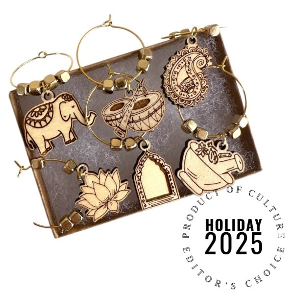 Crafted with precision and a whole lot of love, these one-of-a-kind wine charms are individually hand-drawn, laser-cut, and engraved. Each piece showcases India’s rich cultural heritage and vibrant artistry, making it a unique addition to any gathering.