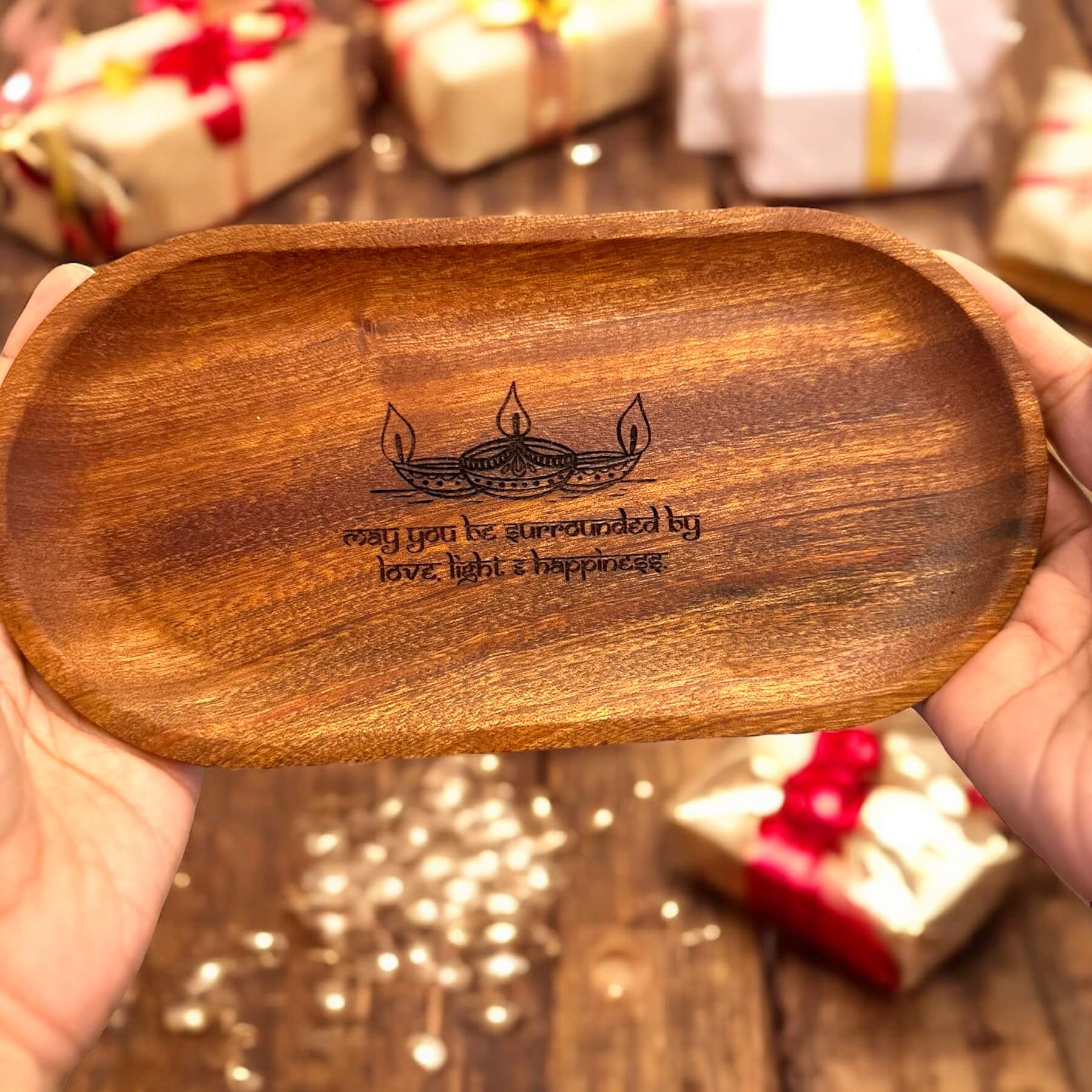 This exquisite wooden tray with gold accent legs is the perfect gift to brighten up any Diwali celebration. Crafted with intricate diya designs and the uplifting message "May you be surrounded by love, light, and happiness," it's a thoughtful and meaningful present for loved ones.